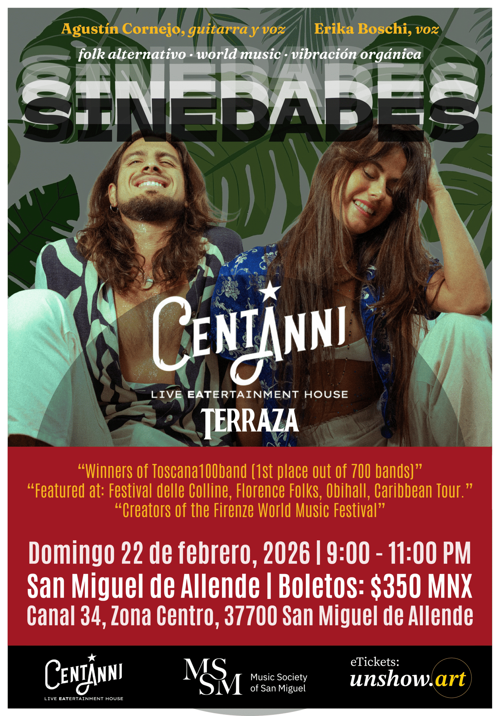Desde Florencia, Italia, llega Sinedades, el dúo internacional formado por la cantante italiana Erika Boschi y el guitarrista argentino Agustín Cornejo, creadores de un universo musical que fusiona el tropicalismo de los años 70, la poesía, la psicodelia y la canción latinoamericana.